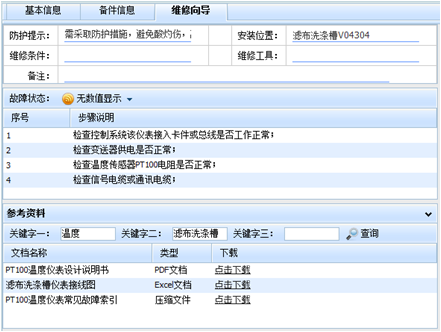 基础库管理 系统将设备预防和预测性维护维修工作涉及的大量基本数据归纳为以下基础库,形成对维护维修工作的完整数据支撑。这些基础库包括:设备库、故障维修知识库、维修过程指导库、维修工具库、维修人员库。 基础库的应用既有静态数据的收集和管理,又有动态数据(包括维修经验、统计分析结果、维修改进方法等)的管理,是实现预防和预测性维护维修的重要支撑部分。